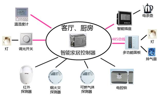 智能電子產(chǎn)品系統(tǒng)網(wǎng)絡(luò)示意圖 1. 家庭控制中心說明: 客廳廚房控制中心 客廳廚房控制中心包含智能家居控制器、電控鎖、多功能面板、節(jié)能燈、排氣扇、智能調(diào)光開關(guān)、智能光強及溫濕度計、智能插座、電茶壺、可燃?xì)怏w探測器、煙火災(zāi)探測器及紅外探測器。 電控鎖通過智能家居控制器控制門的開啟;多功能面板控制客廳、廚房燈的開關(guān);智能調(diào)光開關(guān)調(diào)節(jié)LED燈的亮度、也可通過485總線與智能家居控制器通訊,通過情景模式智能調(diào)節(jié)LED燈的亮度;智能光強及溫濕度計顯示采集客廳溫濕度及光照度;智能插座控制和采集電茶壺的電源和電量信息,可合理分配用電負(fù)荷;可燃?xì)怏w探測器、煙火災(zāi)探測器及紅外探測器用于組件家居系統(tǒng)的安防系統(tǒng)。 多功能面板、智能調(diào)光開關(guān)、智能光強及溫濕度計、智能插座通過485總線與智能家居控制器通訊,可燃?xì)怏w探測器、煙火災(zāi)探測器、紅外探測器及電控鎖通過I\O口與智能家居控制器通訊。