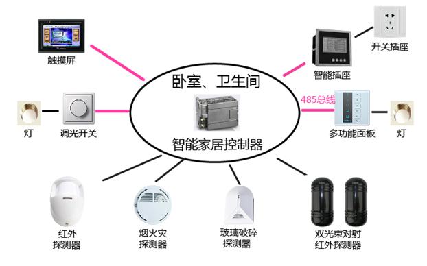 智能電子產(chǎn)品系統(tǒng)客廳廚房安裝配置圖 臥室衛(wèi)生間控制中心 臥室衛(wèi)生間控制中心包含智能家居控制器、觸摸屏、多功能面板、智能調(diào)光開關(guān)、智能插座、煙火災(zāi)探測器、紅外探測器、玻璃破碎探測器、雙光束對射紅外探測器。 觸摸屏通過485與智能家居控制器通訊,可實現(xiàn)遙控、遙信、遙調(diào)及情景模式的設(shè)定;智能調(diào)光開關(guān)調(diào)節(jié)白熾燈的亮度、也可通過485總線與智能家居控制器通訊,通過情景模式智能調(diào)節(jié)白熾燈的亮度;多功能面板控制臥室、衛(wèi)生間燈的開合;智能插座控制和采集相關(guān)用電設(shè)備電源和電量信息,可合理分配用電負(fù)荷;煙火災(zāi)探測器、紅外探測器、玻璃破碎探測器、雙光束對射紅外探測器用于組件家居系統(tǒng)的安防系統(tǒng)。 觸摸屏、多功能面板、智能調(diào)光開關(guān)、智能插座通過485總線與智能家居控制器通訊,煙火災(zāi)探測器、紅外探測器、玻璃破碎探測器及雙光束對射紅外探測器通過I\O口與智能家居控制器通訊。